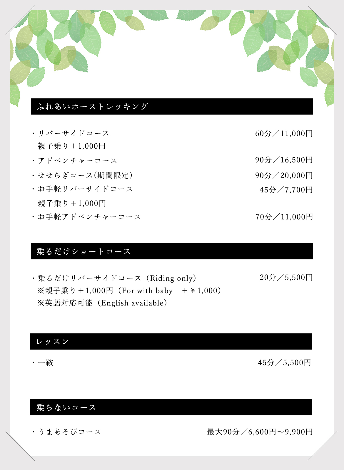 乗馬体験メニュー一覧 / 休馬日と予約満了日のお知らせ / 装備について / 体験の様子